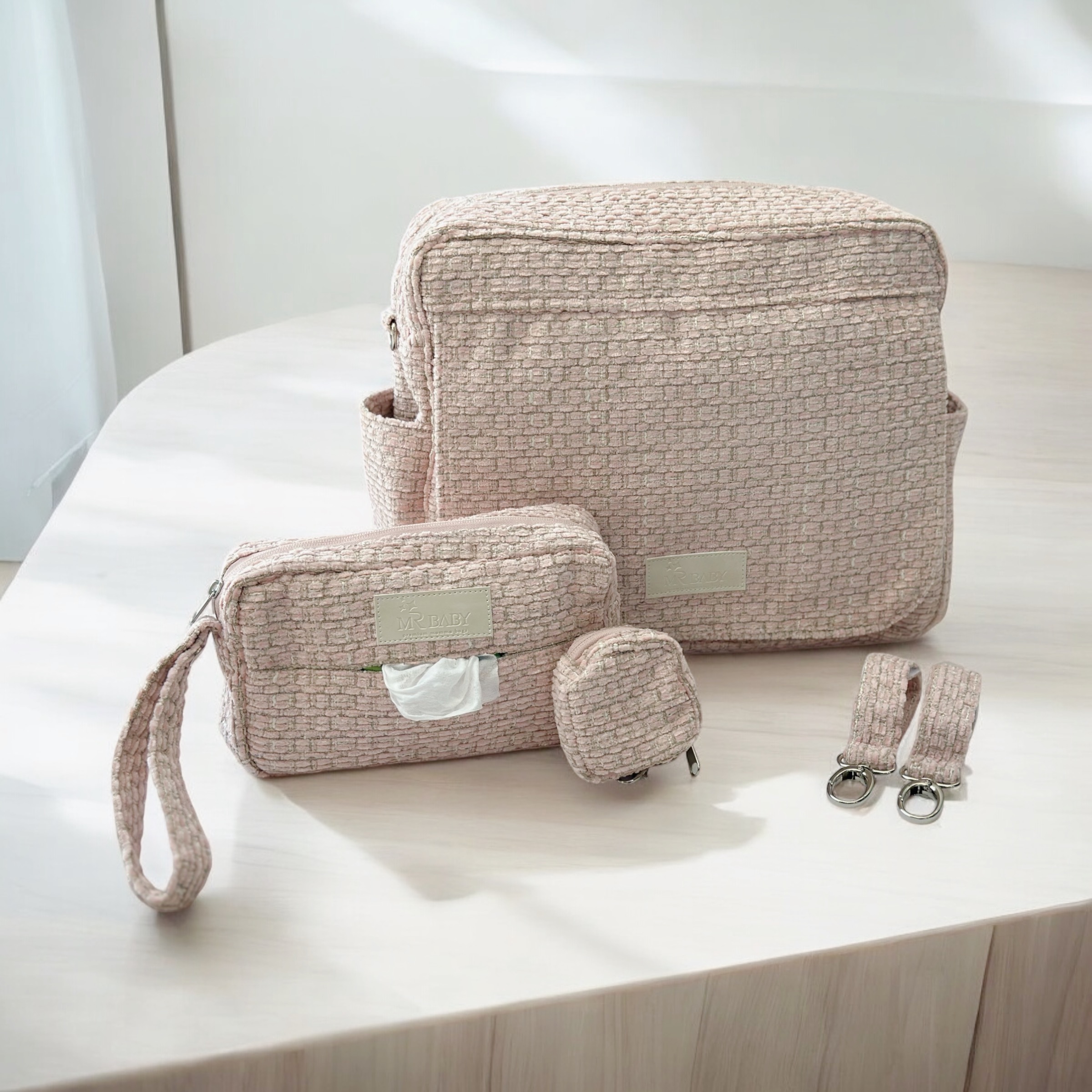 הסט כולל: תיק החתלה ,נרתיק החתלה עם שליפה מהירה של מגבונים, נרתיק מוצצים ,ותופסנים .